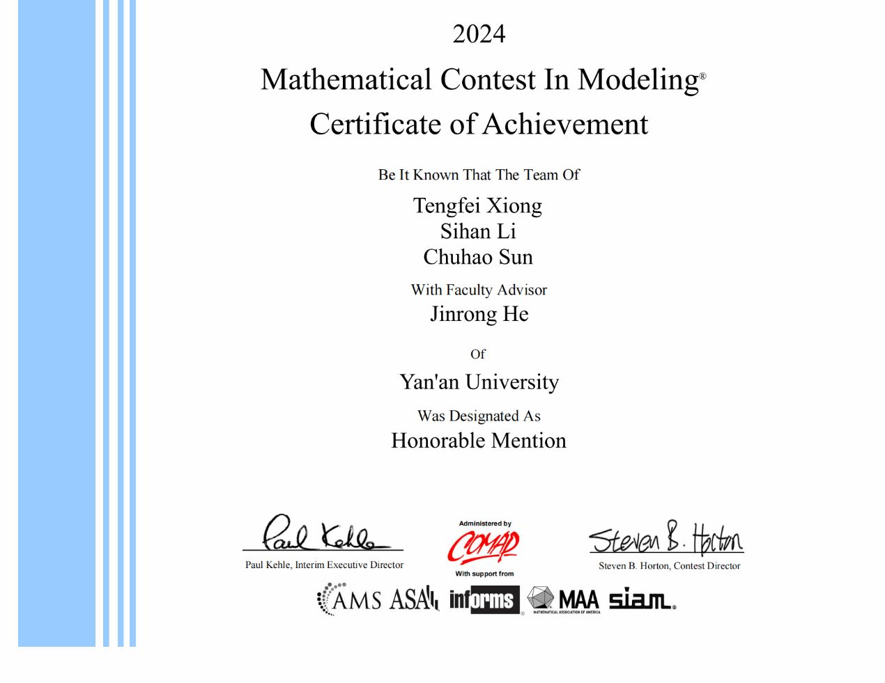 建工学子再创佳绩!304永利集团土木21熊腾飞和工程21李思涵联手先后在2023年度高教社杯全国老员工数学建模大赛获得了陕西赛区二等奖和2024年度美国老员工数学建模大赛中获得了MCM中国际二等奖(Honorable Mention)。